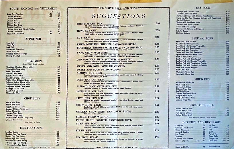 King Wah Chinese Restaurant Menu 1960’s Chicago Chinatown